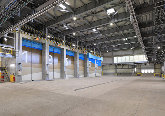 ごみ収集車は、全部で6つの大きな扉(投入扉)の前に停車し、開いた投入扉からごみを投入します。リンピアいなばには、1日に約200台の家庭ごみの収集車や事業所から出た可燃ごみを運ぶ車両が出入りし、運ばれてくるごみは1日で約200トンにもなります。投入扉は、臭気対策や安全対策のため二重になっており、鳥取を代表する景勝地「鳥取砂丘」が描かれています。また、大きなごみは、ごみホッパで詰まってしまう恐れがあるため、プラットホームに設置してある切断機・破砕機で小さくしてからごみピットに投入します。