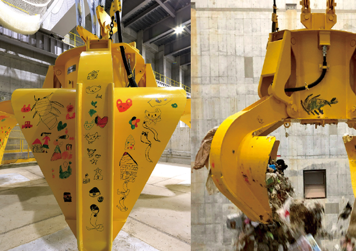 ごみピットに貯められたごみは、焼却炉内で効率的に燃えるようにごみクレーンで混ぜ合わされた後、焼却炉に運ばれます。クレーンは1つかみ約5トンのごみを持ち上げることができます。クレーンの爪は開くと4.6メートルあり、通常は自動で運転しています。地元河原幼稚園園児にお絵かきをしていただき、世界で一つのごみクレーンになりました。