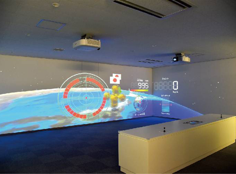 宇宙船で3つの壁面に映し出される地球のごみを回収する体験型環境啓発設備です。