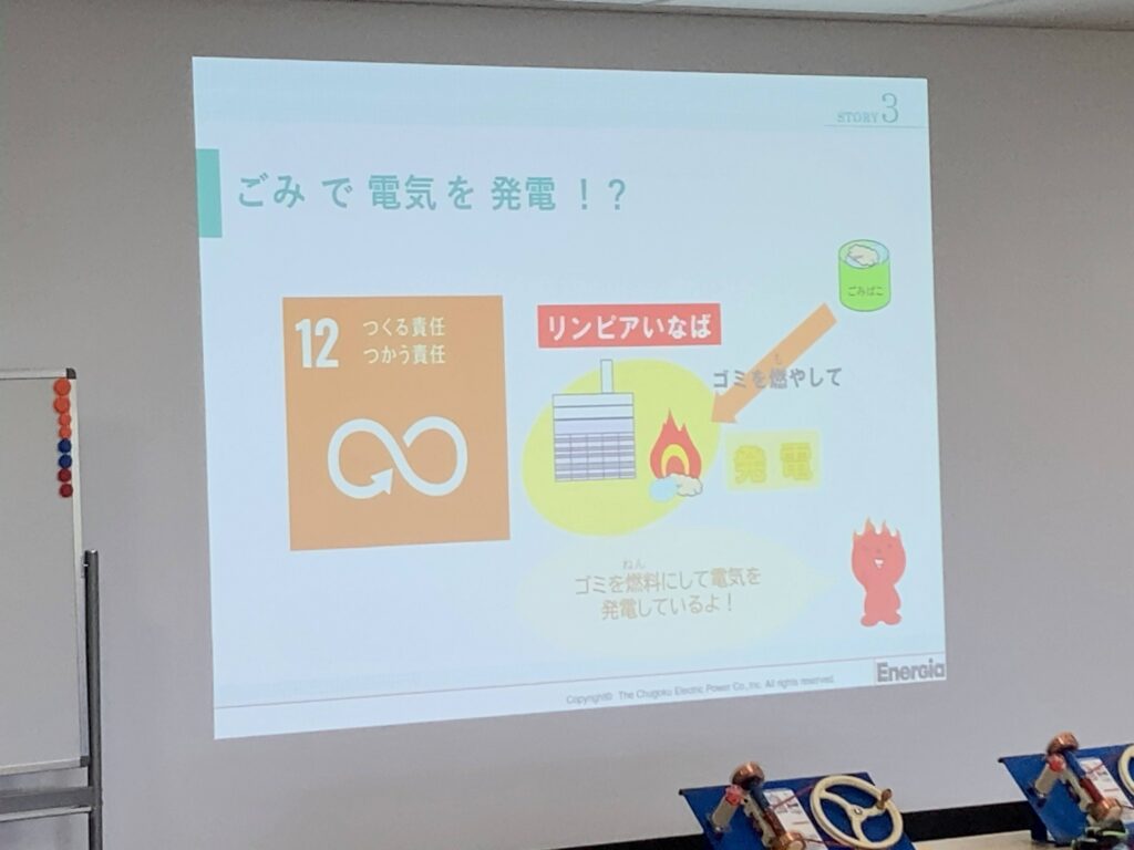 見学後には、中国電力株式会社によるSDGs(持続可能な開発目標)や発電のしくみに関する授業も行われました。参加者の皆さんは、施設見学や授業で熱心にメモを取り、積極的に質問をされておられました。